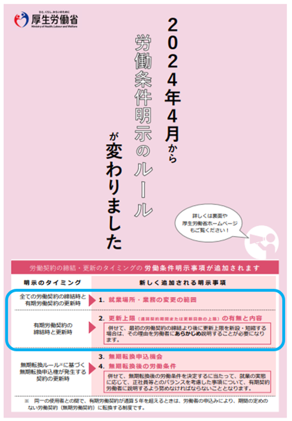 出典:厚生労働省作成パンフレット「2024年4月からの労働条件明示のルール変更 備えは大丈夫ですか?」P20より一部抜粋し、加工して作成