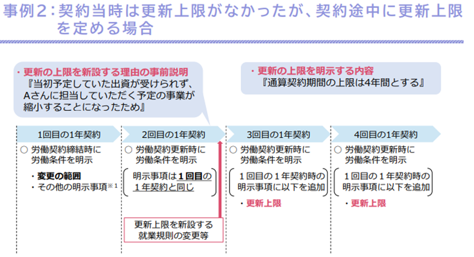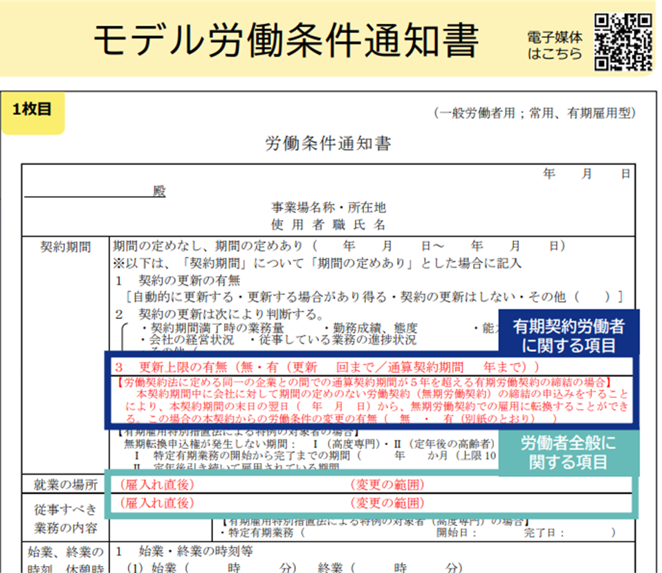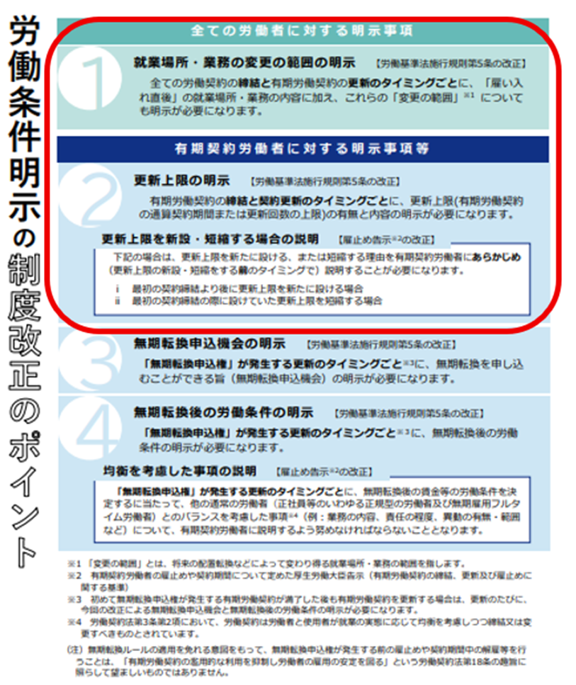 そして、「1 就業場所・業務の変更の範囲の明示」は全労働者が、「2 更新上限の有無及び内容等の明示」は有期労働者が対象です。
