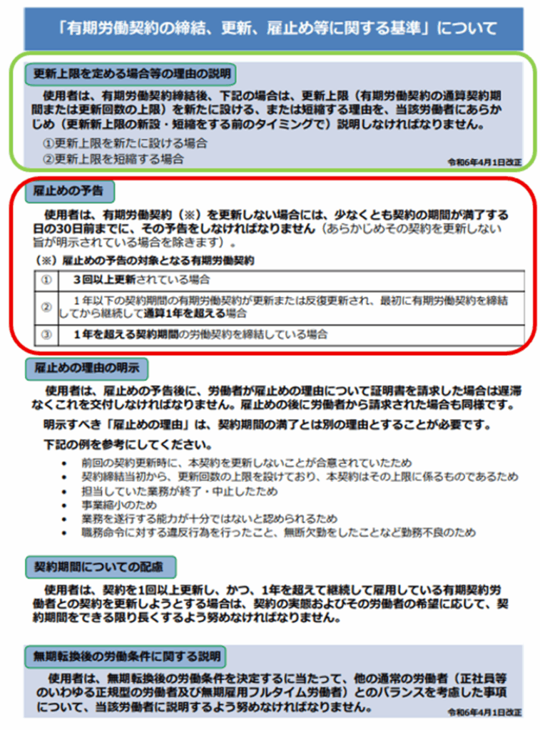例えば3回以上更新されている有期契約を雇止めする場合、期間満了の少なくとも30日前までに予告しなければなりません。