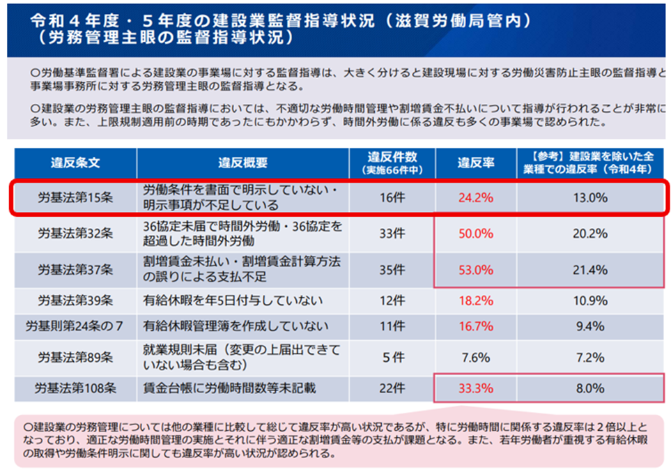 この労働条件明示について、滋賀労働局という限られたエリアなのですが、建設業での監督指導状況のデータがありましたので、ご紹介します。