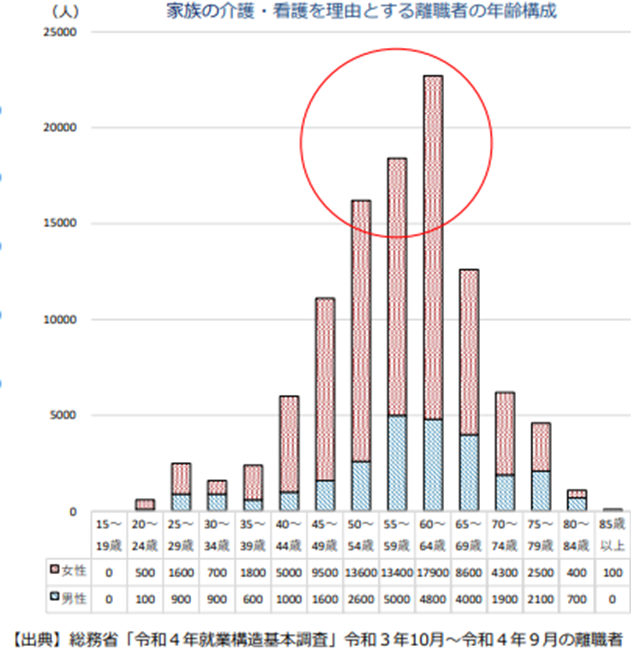 介護離職者の多くは50代で、女性が男性に比べると多いことが分かります。この50代は、企業においてベテランや管理職として働き盛りの年代のため、この層が抜けることによるダメージは大きいです。