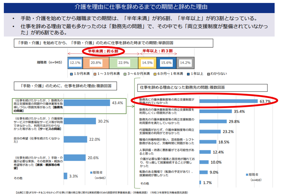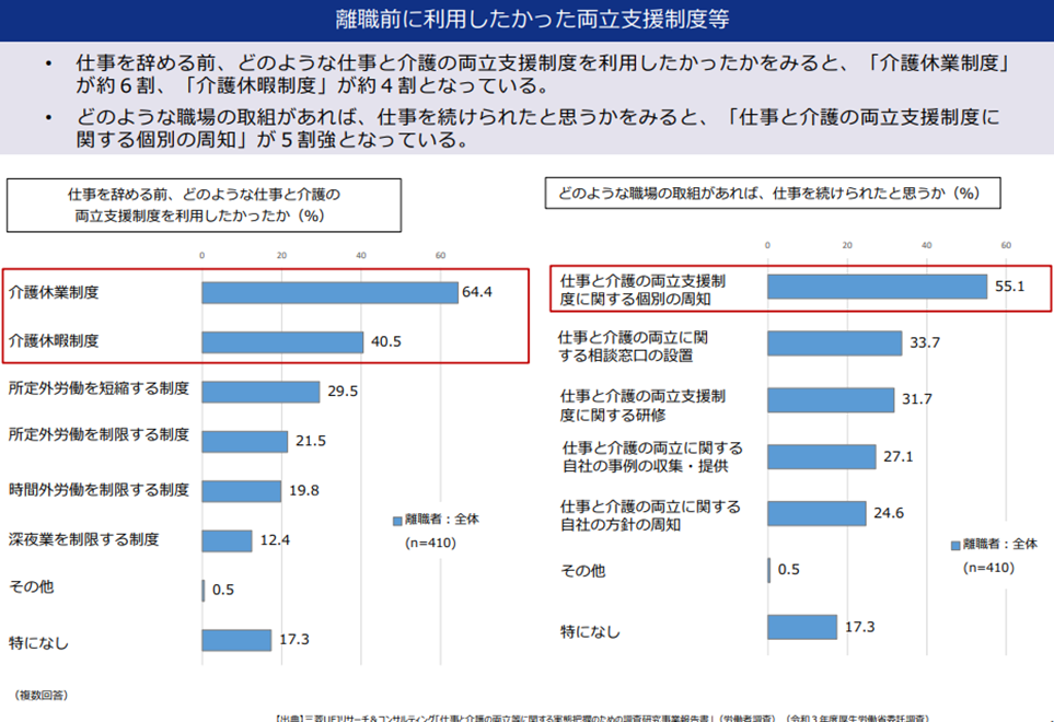 やはり、離職理由として多いのは「両立支援制度」の未整備で、当該制度の個別の周知があれば仕事を続けられたと思う人は半数以上おられます。