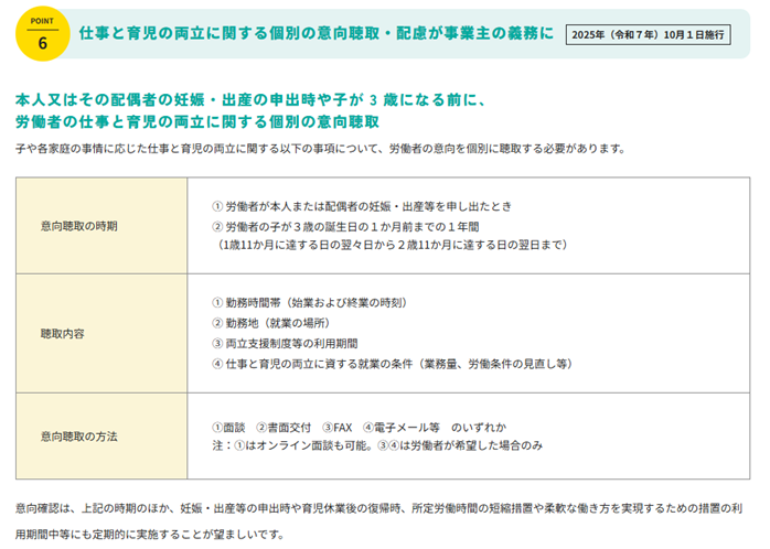 出典:厚生労働省HP「育児休業制度」の「法改正のポイント」にある「聴取した労働者の意向についての配慮」より一部抜粋・加工して作成
