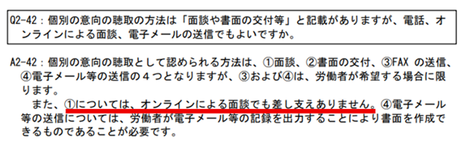 原則として、面談又は書面交付が必要ですが、オンライン面談も可能ということに注意が必要です。例えば、育休中などで職場に来ることがあまりない場合などには、必要に応じてオンライン面談を活用することが可能です。