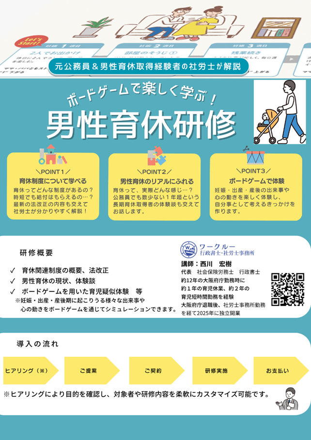 具体的には、社労士として法制度の説明などを行うほか、1年以上の男性育休経験者(単独での育休取得)として、ボードゲーム形式で楽しみながら、男性育休のリアルについて学べる研修です。対象者の属性(管理職、一般従業員など)や目的等に応じて、個別対応可能です。
