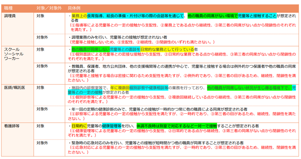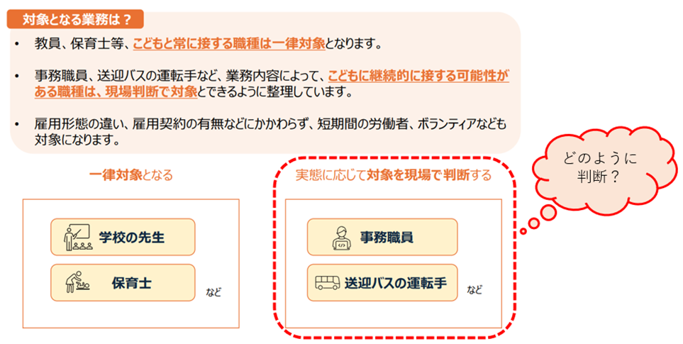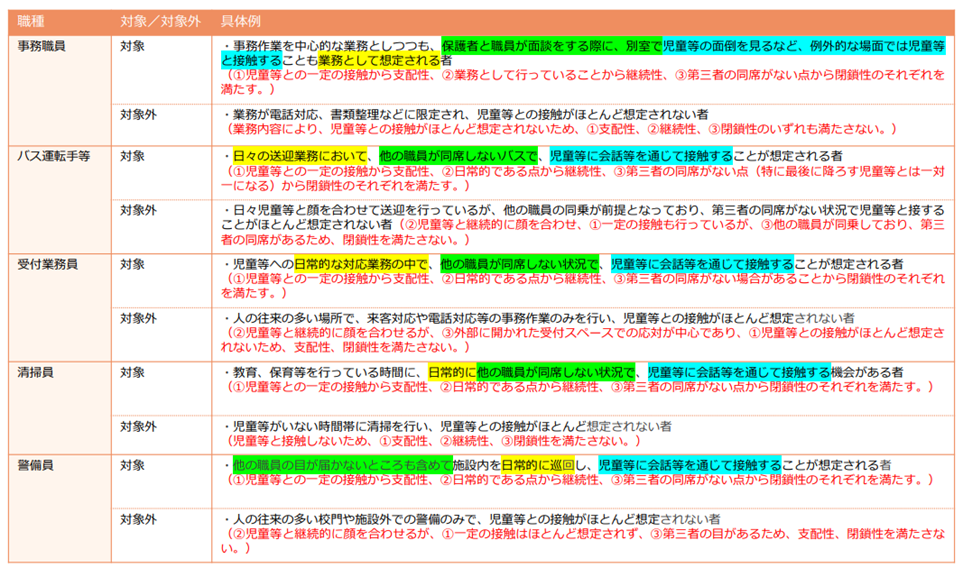 このように、保育士等のこどもと常に接する職種は一律対象となりますが、実態に応じて現場ごとに対象かどうかを判断する必要がある職種(事務職員等)もあります。