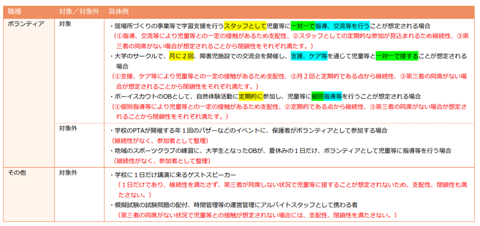 こども性暴力防止法では、性犯罪歴を確認する「犯罪事実確認」の対象となる職種について、以下のとおり定めています。