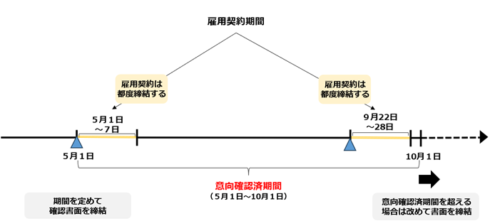 上記の例では、再度の雇用契約期間(9月22日~28日)が、意向確認済期間(5月1日~10月1日)の範囲内なので、2回目の雇用契約時の犯罪事実確認は不要となります。